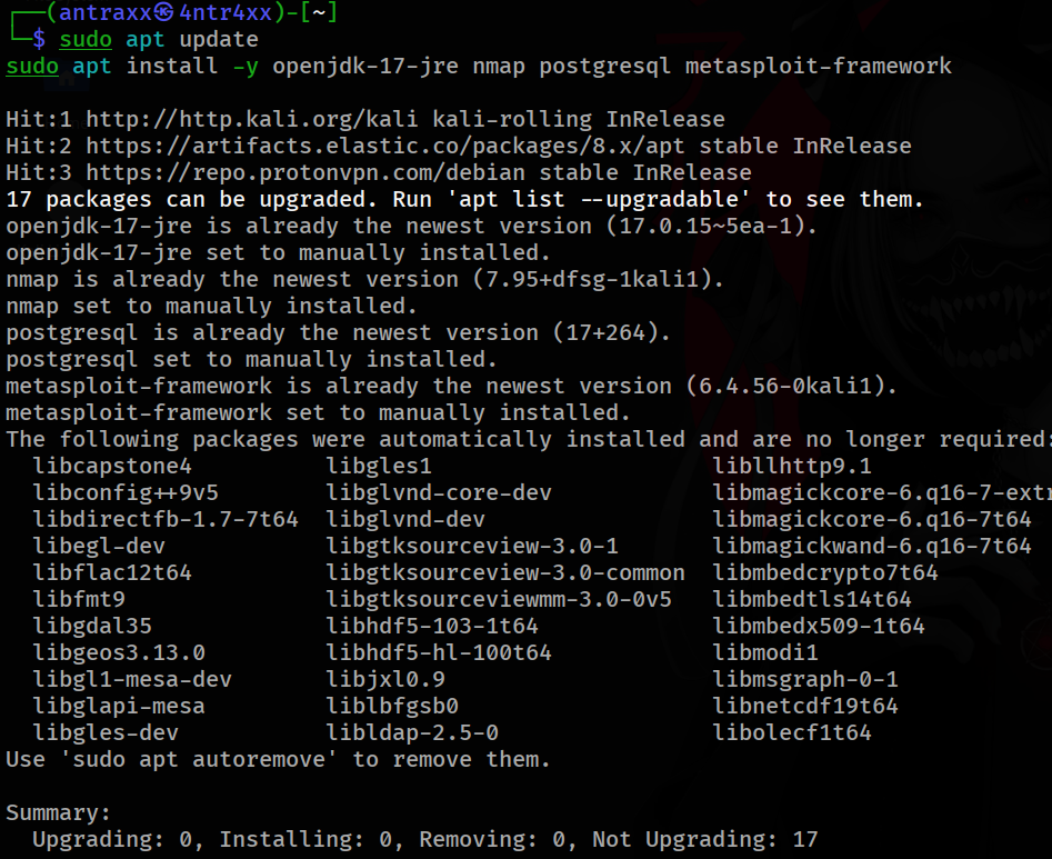 sudo apt install -y openjdk-17-jre nmap postgresql metasploit-framework