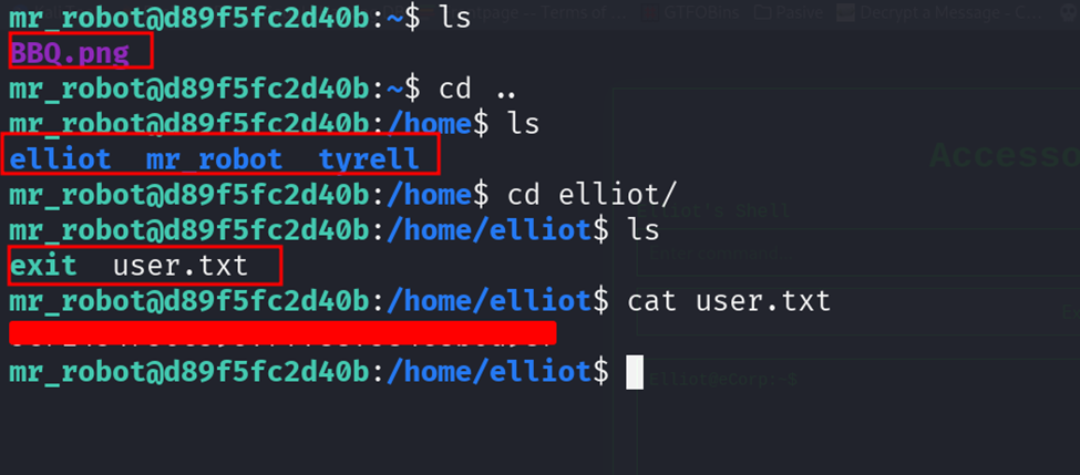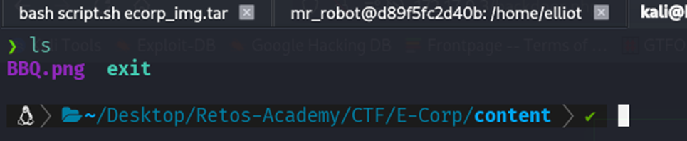 Encontramos la primer flag en el directorio del usuario elliot, pero también encontramos algunos archivos interesantes, como el BBQ.png y el binario exit, las extraemos a nuestra maquina atacante para analizarlas revisar su contenido o metadatos, recuerden nunca dejar pasar por desapercibido nada.