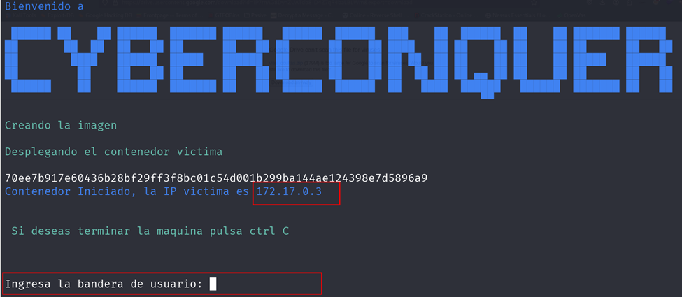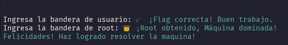 Una vez ejecutado el comando nos aparecerá un banner donde podremos ver la IP de la maquina y un prompt donde podremos colocar las banderas a nivel usuario, un vez habiendo encontrado esa bandera aparecerá el prompt para la bandera root.