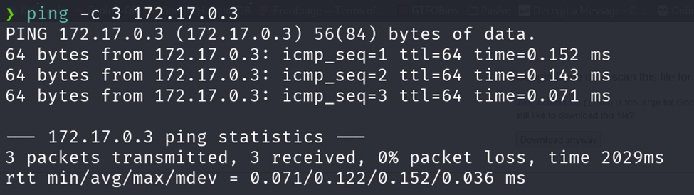 Una vez levantado el laboratorio comprobamos la conexión con la maquina mandándole 3 paquetes ICMP utilizando ping