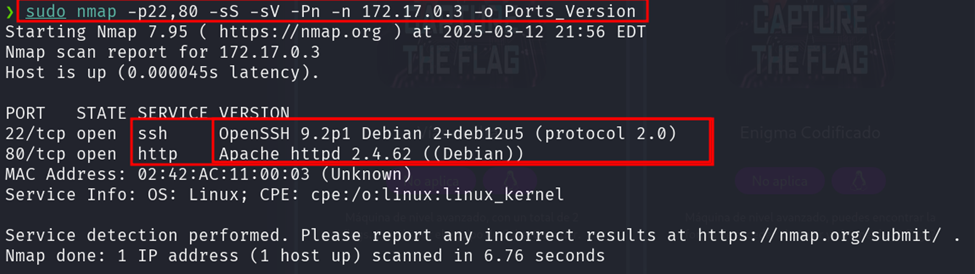 ·         `sudo nmap -p22,80 -sS -sV -Pn -n 172.17.0.3 -o Ports_Version`