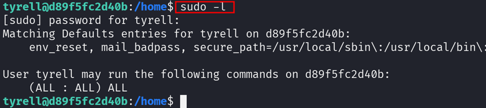 ¡Bingo!, el código en el binario **“exit”** era la pass para el usuario tyrell, procedemos a hacer un sudo -l poniendo nuevamente la contraseña encontrada