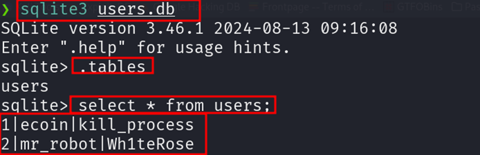 Revisamos el archivo users.db con la herramienta sqlite3 para ver su contenido