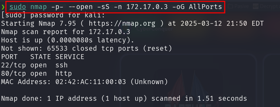 ·         `sudo nmap -p- --open -sS -n 172.17.0.3 -oG AllPorts`