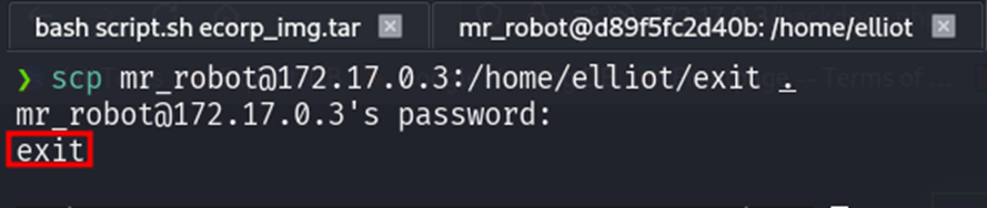 •  `scp mr_robot@172.17.0.3:/home/elliot/exit .`