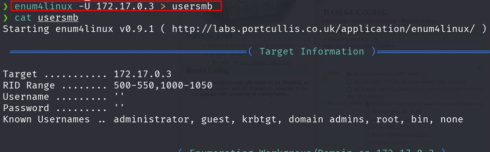 ·        `enum4linux -U 172.17.0.3 > usersmb` &#x20;