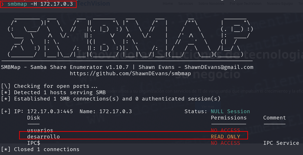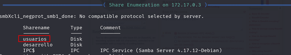 ·        `smbclient //172.17.0.3/desarrollo -N`  &#x20;