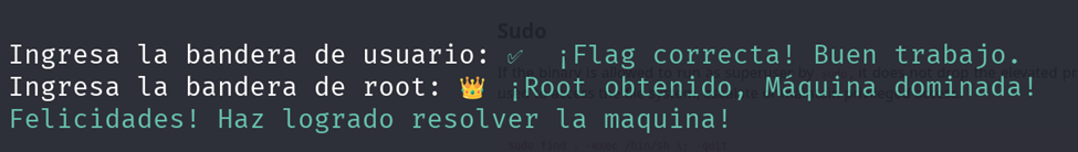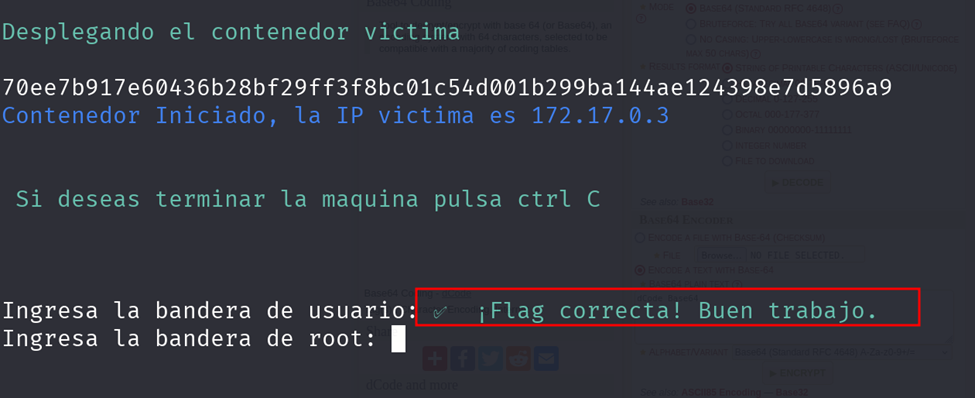 Una vez ejecutado el comando nos aparecerá un banner donde podremos ver la IP de la maquina y un prompt donde podremos colocar las banderas a nivel usuario, un vez habiendo encontrado esa bandera aparecerá el prompt para la bandera root.
