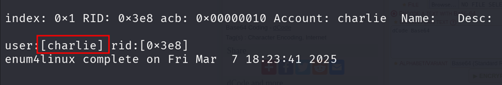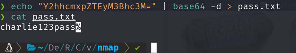 ·         echo "Y2hhcmxpZTEyM3Bhc3M=" | base64 -d > pass.txt&#x20;