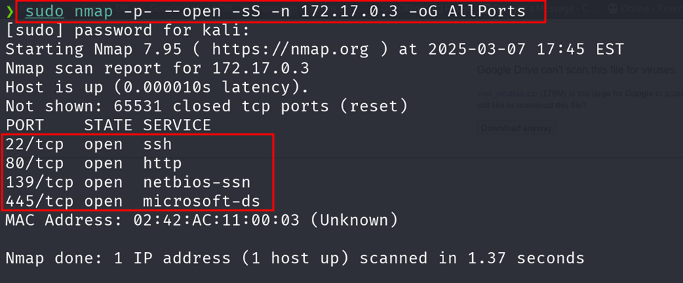 ·         `sudo nmap -p- --open -sS -n 172.17.0.3 -oG AllPorts`