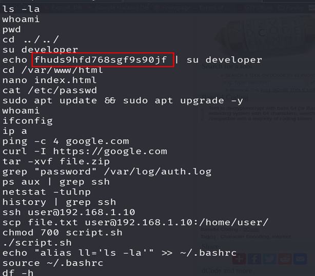El archivo .bash\_history encontramos una posible contraseña y otro usuario developer, intentamos usarla en el servicio ssh por el puerto 22, no sin antes guardar la contraseña en un archivo .txt, recuerden, siempre es importante guardar todo lo que encontremos.