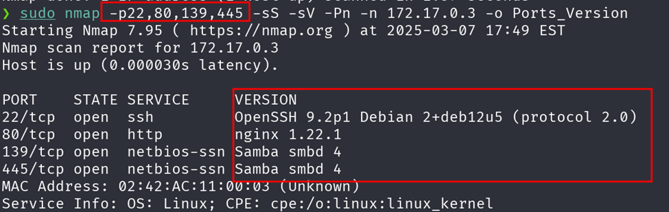 ·         `sudo nmap -p22,80,139,445 -sS -sV -Pn -n 172.17.0.3 -o Ports_Version`&#x20;